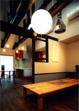 天井を斜めに高くし、中央の壁部分は 耐震対策として残し、湿気の調節、消臭 などの効果を持った材料で仕上げ、視